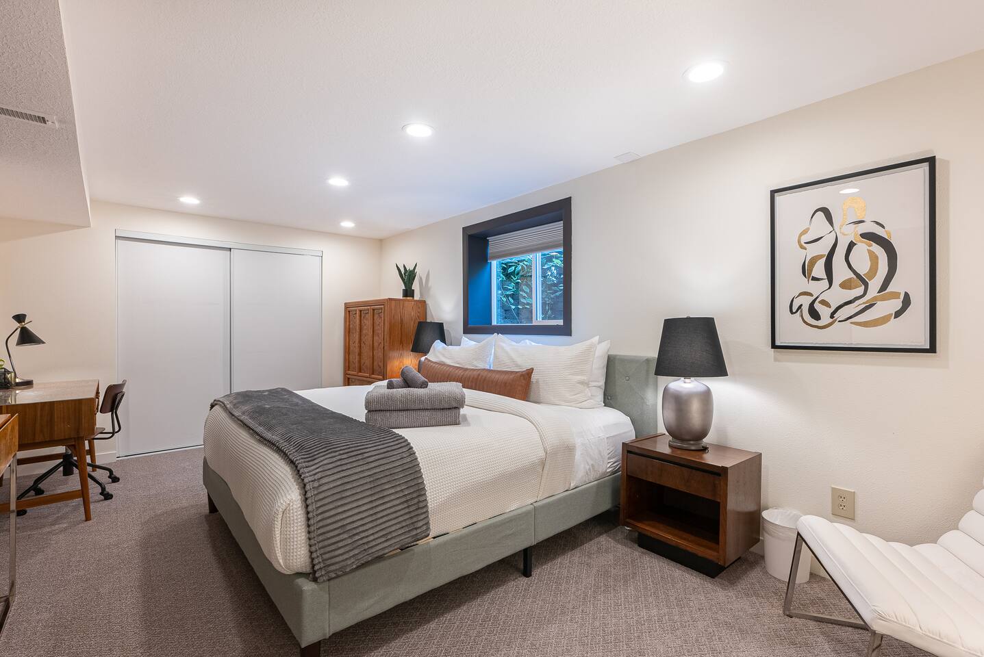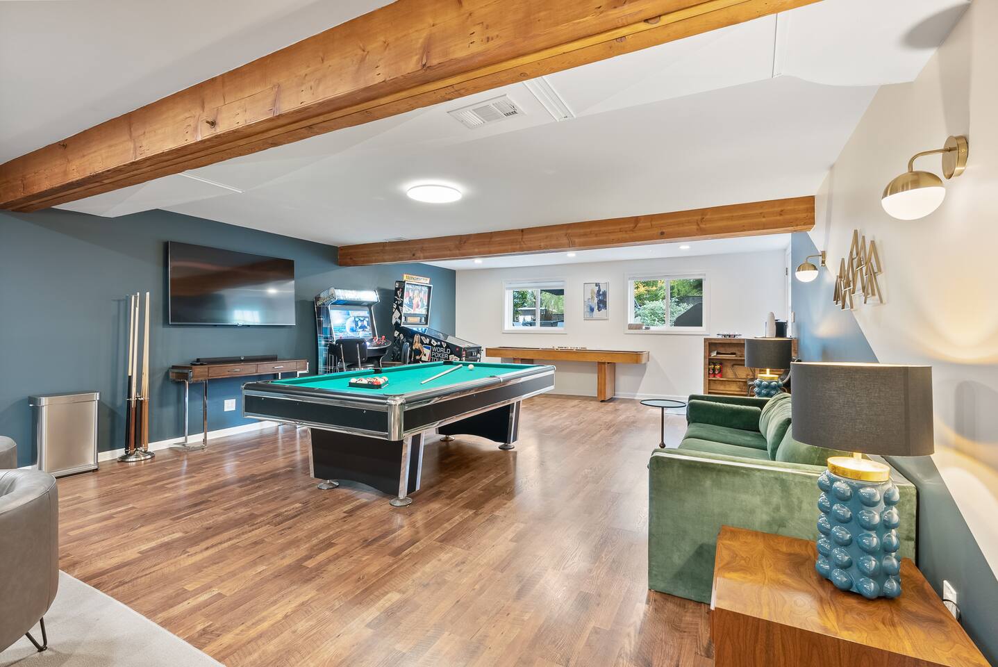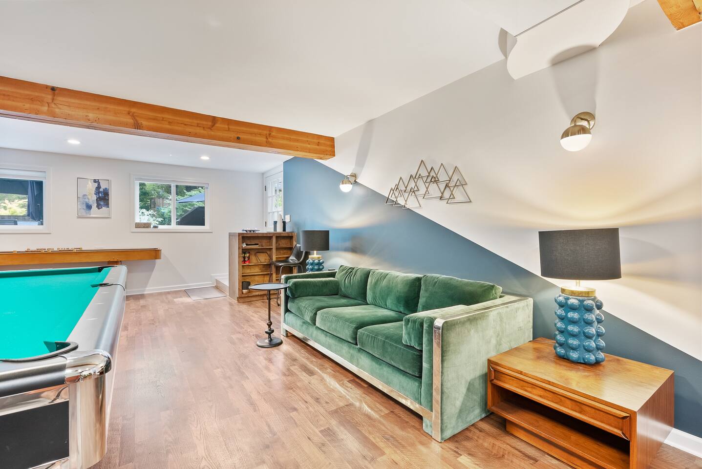 This fun-filled home is the perfect stop for traveling friends or family! With 5 bedrooms on two levels, there is plenty of room to spread out in this 3,000 square foot home. The game room is AMAZING and features a pool table, shuffleboard, stand-up 4 person arcade, pinball and poker table! And did we mention the sauna? Hillside is also pet-friendly (with pet fees), and has a beautifully landscaped, fully-fenced backyard where you can enjoy a soak in the hot tub. Traveling for work? We've got you covered with gigabit wi-fi. No matter what you're seeking, Hillside is THE perfect place for you! HIGHLIGHT REEL: * 3,000+ Square Foot House * Huge Game Room. -- Brand New Pool Table -- Shuffleboard Table -- 4-Player Multi-Game Standup Arcade! -- Pinball -- Poker Table & Chairs -65" TV w/ Complimentary Streaming Services # Hot Tub & Sauna! * 5 Full & Private Bedrooms --4 bedrooms feature King beds -- 1 bedroom features a Queen bed * Two Full Bathrooms -- Bathroom #1 - Walk-in shower -- Bathroom #2 - Shower & sauna * Beautiful Fully-Fenced Backyard w/ Patio Seating & Hot Tub * Large, Open Living Area w/ Fireplace & TV * 5 Large-Screen TVs Throughout the Home - Complimentary Streaming! * Off-Street Parking for 6 Cars * Blueberry Bushes - Pick Your Own! * Dog friendly! $100 per pet, per stay